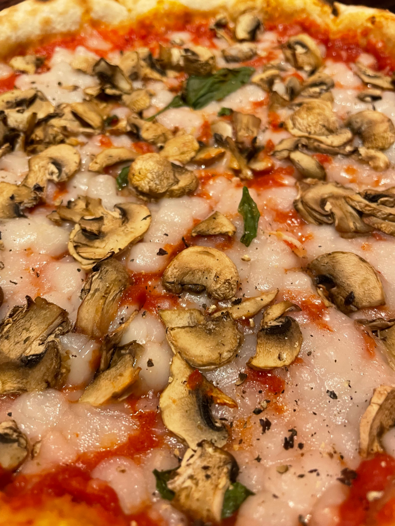 The Pizza is delicious, you can either choose a select option – Usually changes from either a ‘No-chicken’ pizza or a ‘No-meat’ meatball choice -. I personally always get the (Vegan) Margherita and add a selection of vegetables on top!