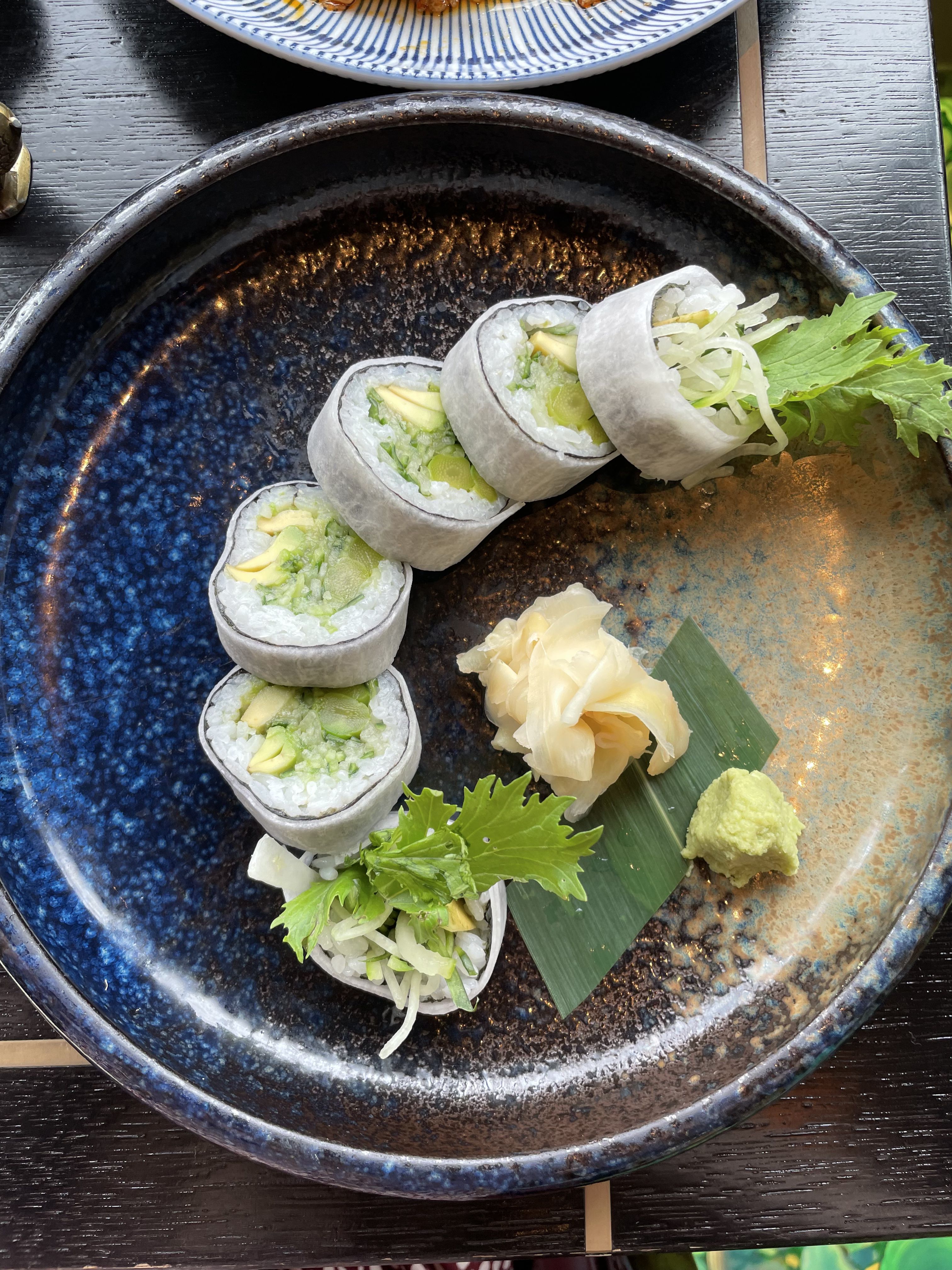 - Avocado, cucumber and asparagus maki roll (the only vegan roll option)