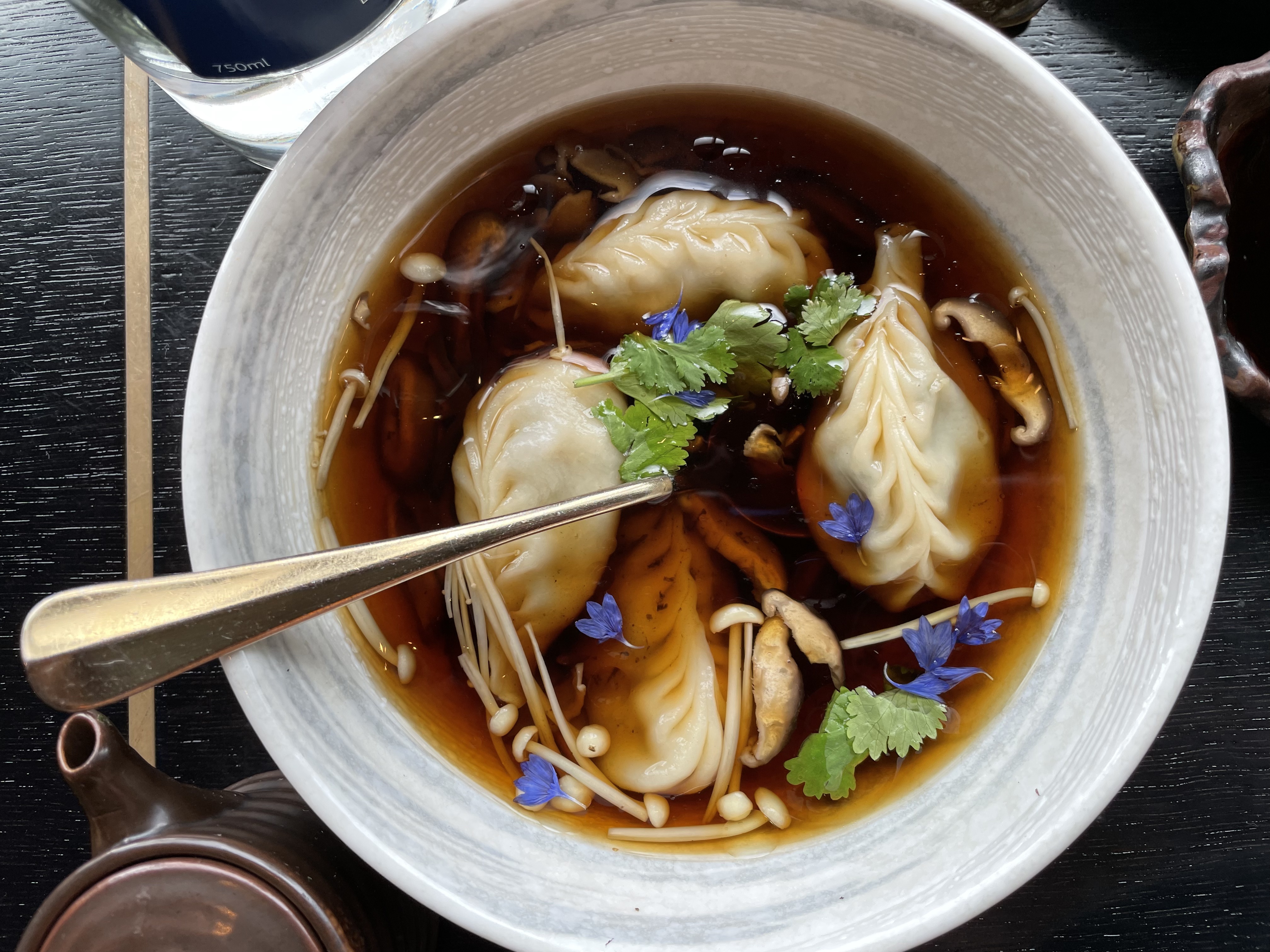 - Spinach & mushroom gyoza, served in a fragrant ginger dashi with black truffle